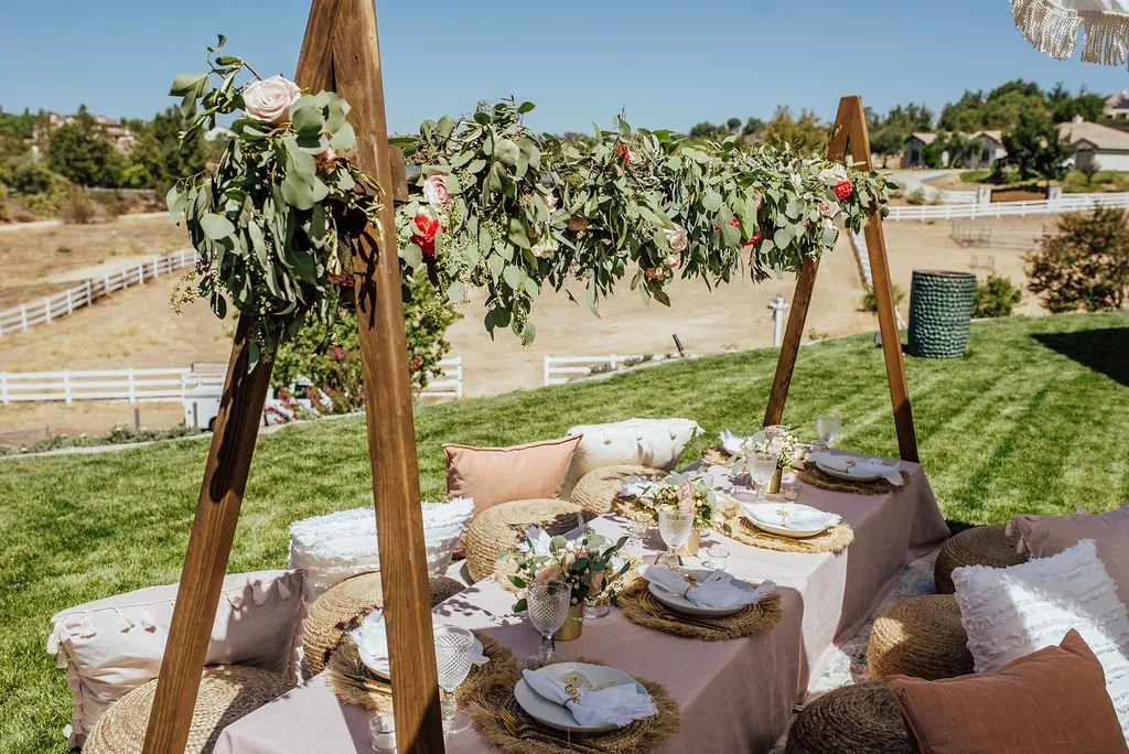 Add this beautiful wooden arch to your intimate picnic for two. It’s the perfect touch to create a memorable "wow" factor for your proposal or romantic getaway. The arch comes adorned with plenty of florals and roses to match your picnic theme, and we can even add fairy lights to illuminate the night! This is available fully loaded with florals for $375. Lights are free to add.