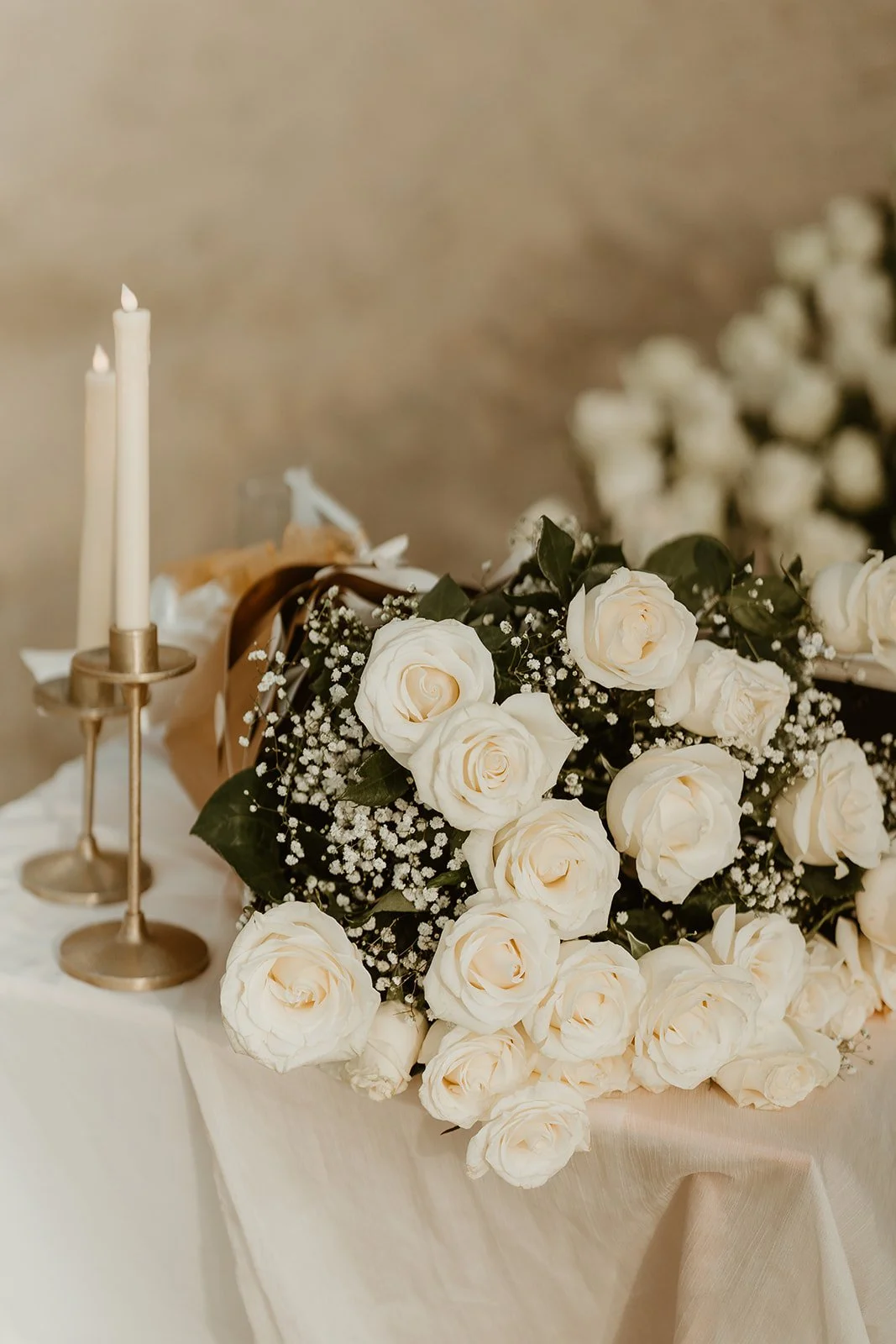 Add a stunning rose bouquet to your upcoming proposal! It’s perfect for your partner to hold during photos and makes a beautiful keepsake to take home after the moment. 2 Dozen is available for $180. 1 Dozen is available for $145
