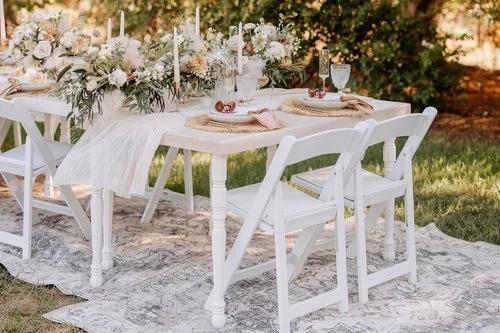 Experience the charm of our beautiful wooden picnic tables, designed at a comfortable regular dining table height of 28 inches. Accompanied by event chairs, available for rental and transport at $7.50 each.