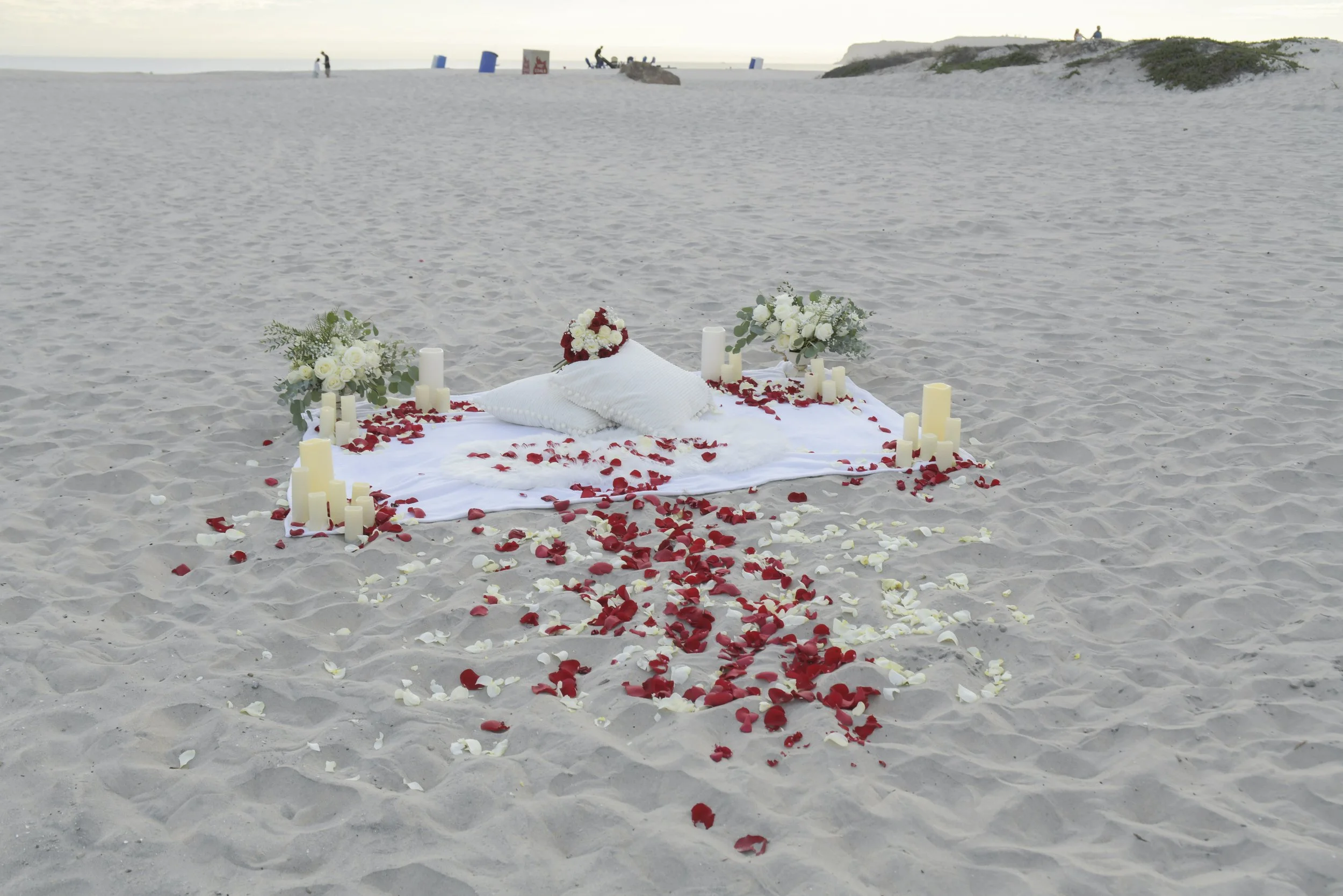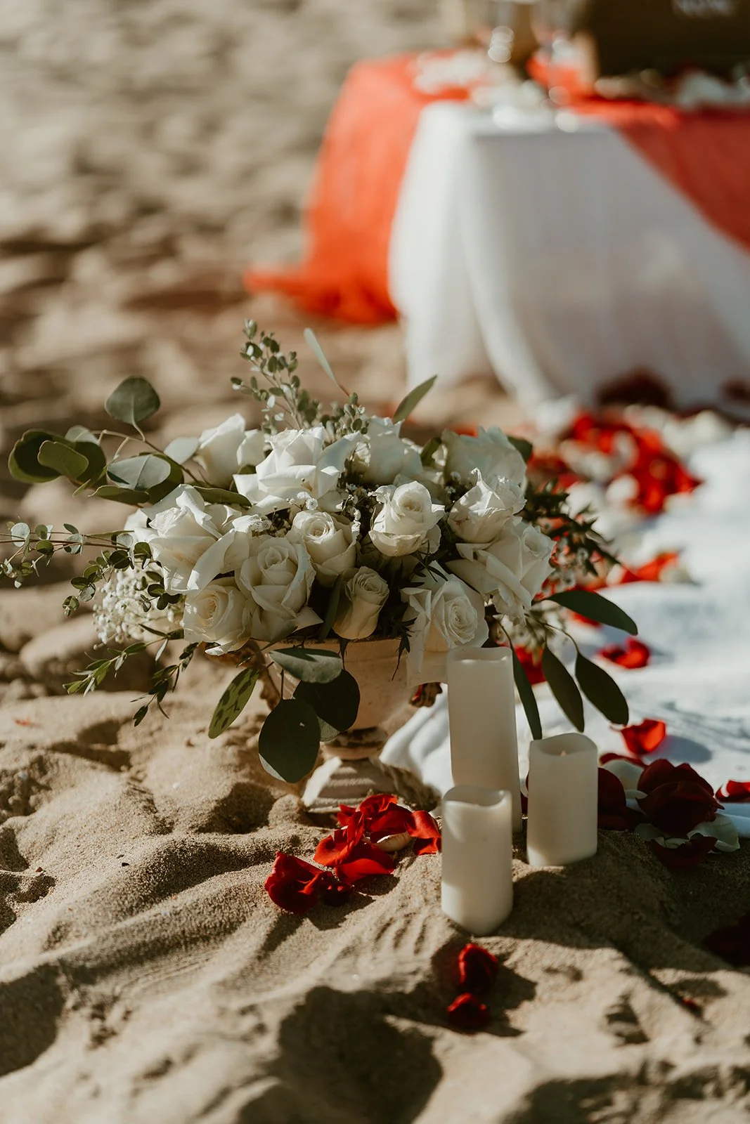 Our Bouquet & Blossom Proposal Package offers a beautiful and minimal setting for you and your partner. We can customize the colors of the floral centerpieces, bouquet, and rose petal litter to match your exact preferences, whether you envision all white, touches of red or pink, or a unique combination that feels just right for the two of you.