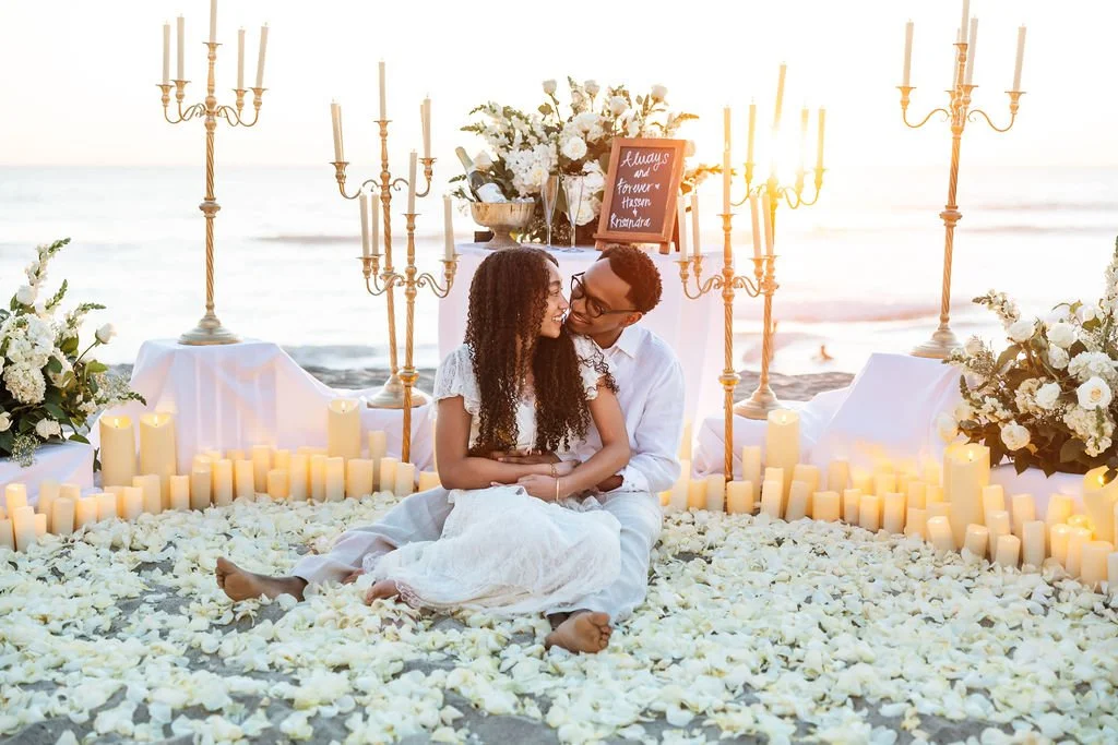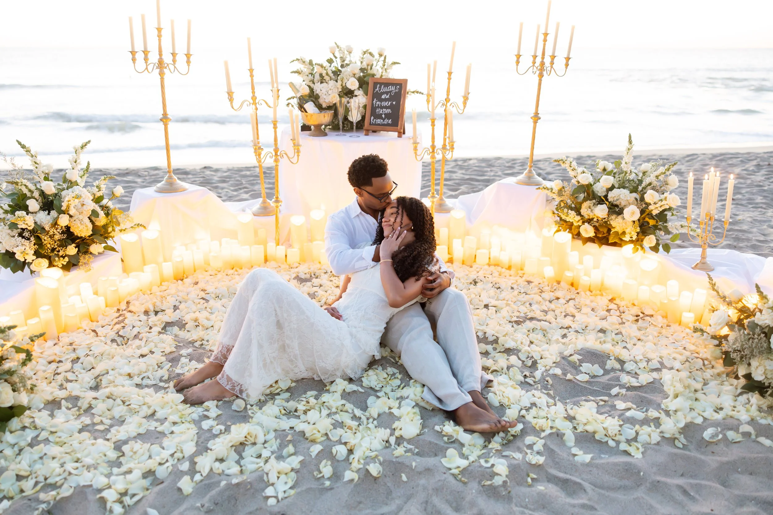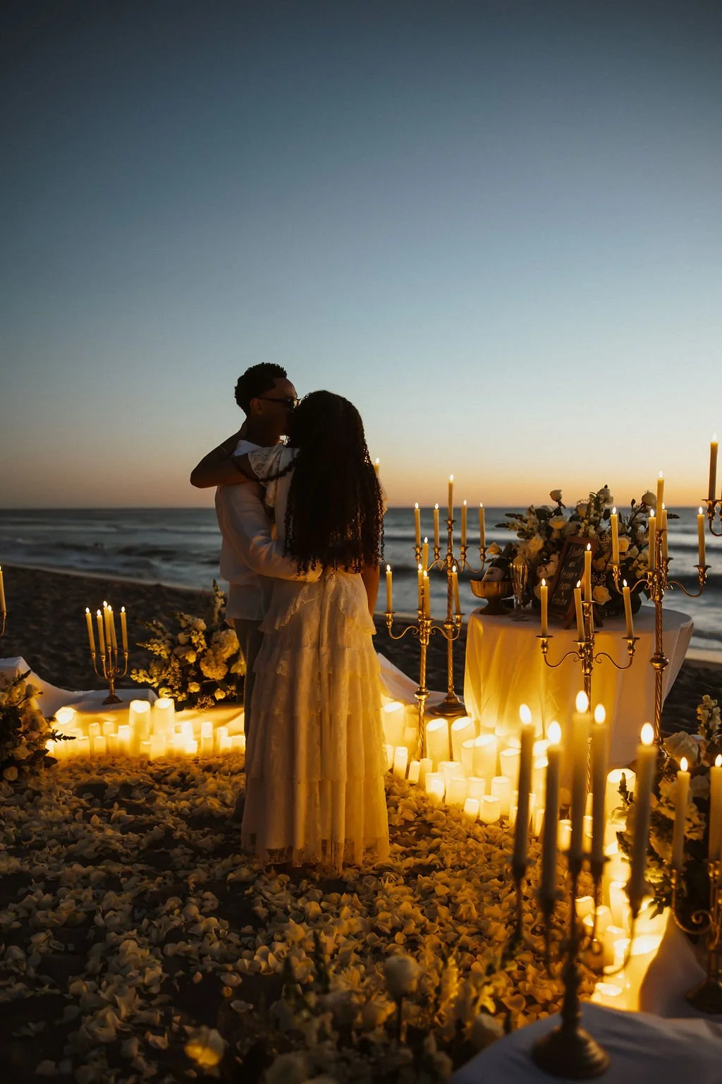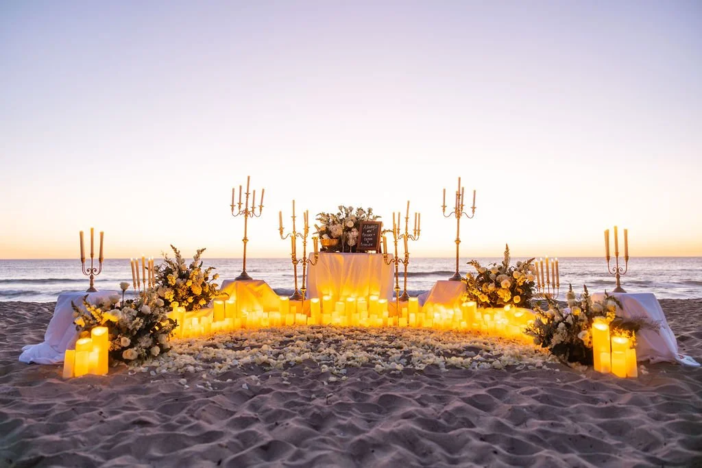 The Enchanted Candelabra Proposal Package is one of our most elegant and breathtaking proposal setups, featuring 10 candelabras, 5 fresh floral bushes, hundreds of romantic candles, and 12 dozen rose petals arranged in a stunning half-moon design to create an unforgettable backdrop for your special moment. A fully covered carpet of rose petal litter and glowing candlelight surrounds you and your partner, creating a luxurious and intimate atmosphere that feels truly magical. This package is best experienced at sunset, when the natural sunlight begins to fade and the hundreds of candles illuminate the space, setting the stage for a beautifully romantic proposal.