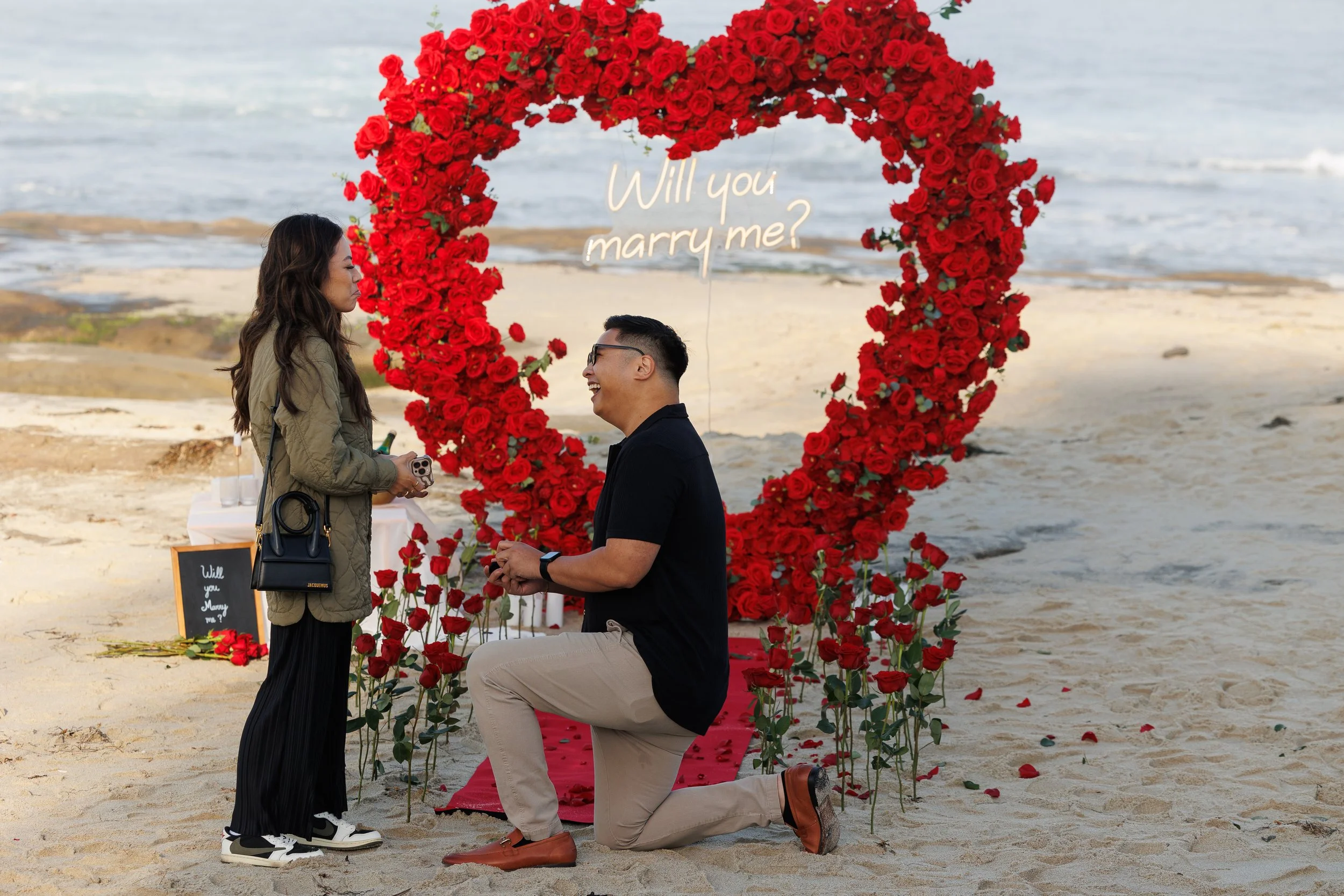 Our Heart Arch Proposal Package includes a stunning 7ft heart arch in White, Red, or Pink staged beautifully framing a perfect snapshot of your special day! Create the perfect opportunity to bask in this once in a life time moment. This is our most popular package and a timeless favorite, perfect for anyone who loves the iconic heart arch. It includes everything you need for a stunning setup, with fully customizable colors to match your vision, whether that is a white heart with red and pink roses, a red heart with mixed blooms, or something entirely unique. The possibilities are endless, and if you are not sure what direction to take, we are here to offer helpful suggestions!