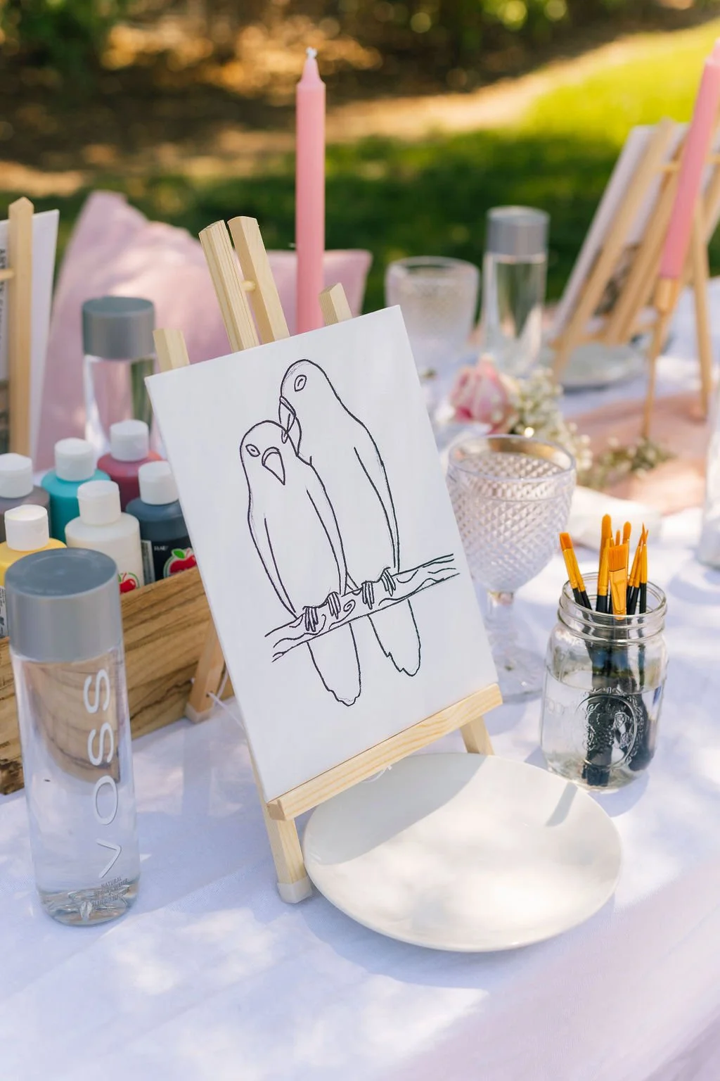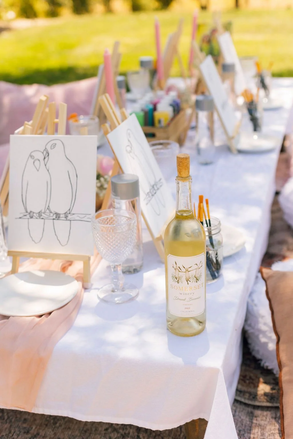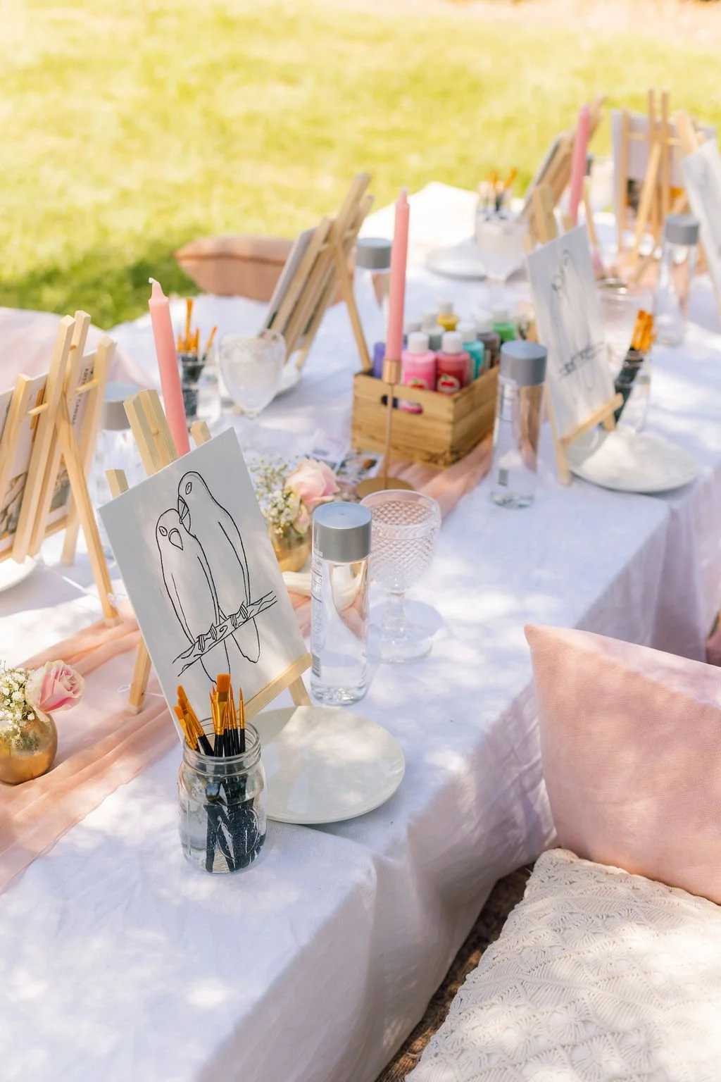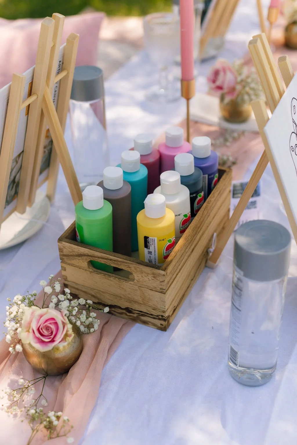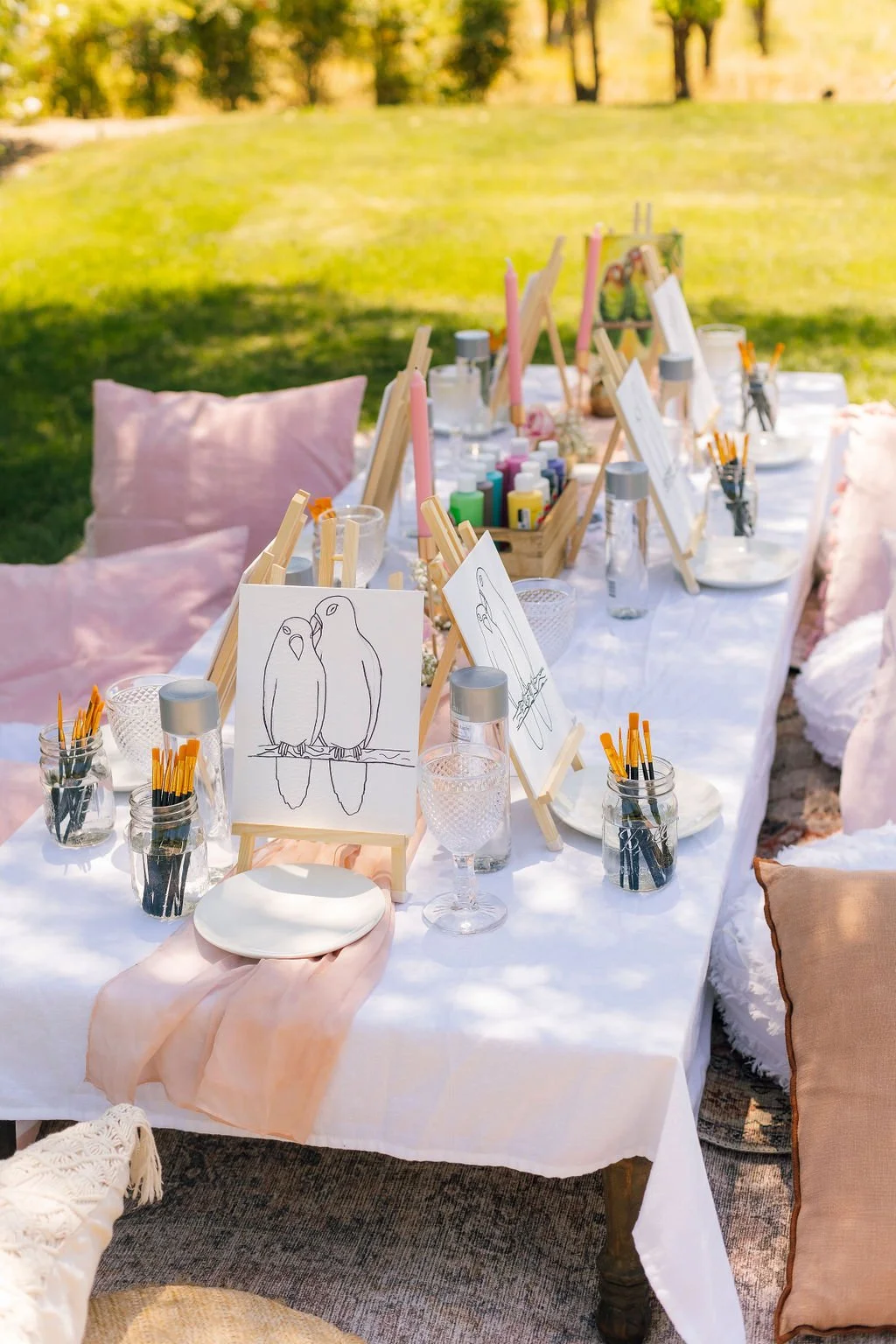 Painting materials will be set out first. You still receive everything that is included along with your luxury picnic. We simply set aside the place settings to allow space for the painting materials, allowing you to grab whatever you may need for food once you are done painting your beautiful masterpiece. This allows the paint to dry by the time your picnic is done!